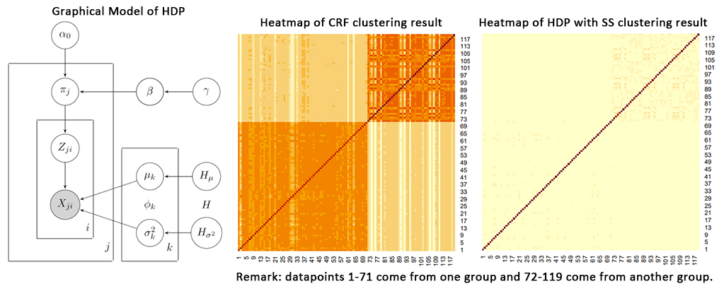 Hierarchical Dirichlet Process (HDP): This is a expansion of Dirichlet Process (DP), which is an nonparametric Bayesian. In HDP, we set a prior distribution for the base distribution of DP to reflect its variation. Therefore, HDP is more flexible than DP but more computational expensive.