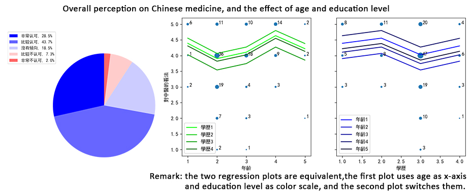We collected 153 valid answers. I used linear regression on the first problem. As the ages and education level were ordinal categorical variables, and to analyze the difference between each two neighbor categories, I encoded with staircase dummy variables. The result showed that generally, the age had positive effect ,and education level had weak negative effect on perception. Besides, I found people thought Chinese medicine is more effective in treating minor and chronic diseases.